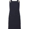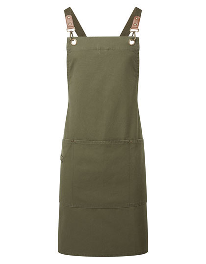 Recycelter Polyester | Schürze mit Kreuzrücken | Robustes und strapazierfähiges Canvas | Schnallen zur Sicherung der Bänder | Kunstlederdetail | Drei große aufgesetzte Taschen mit Nietendetail | Aufhänger aus dem gleichen Material | Ösen aus Rotguss/antikem Messing
