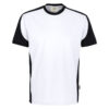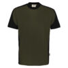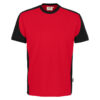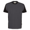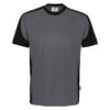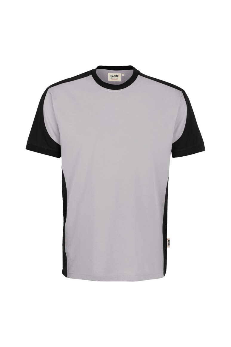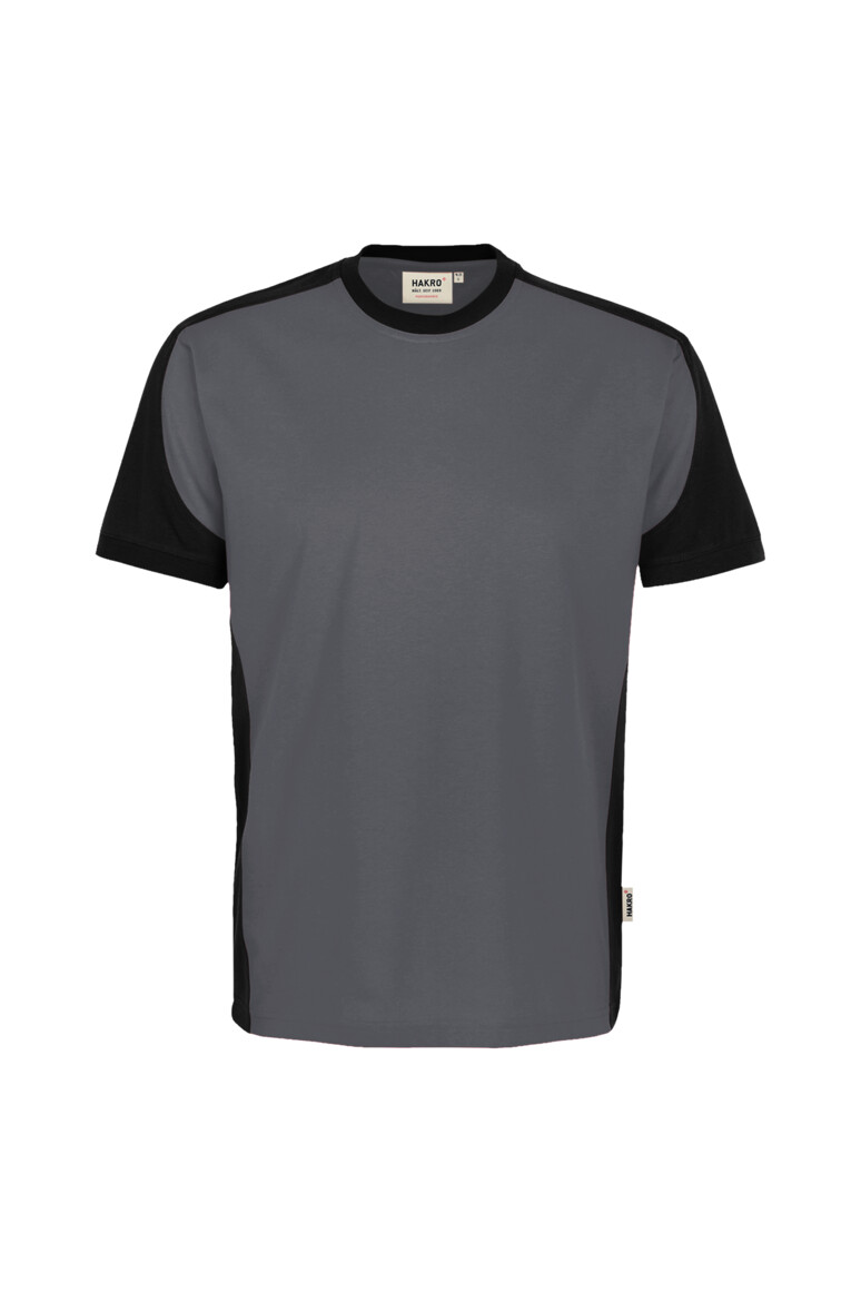 Besonders strapazierfähiges T-Shirt mit Einsätzen in Kontrastfarbe Schwarz an den Seiten, Schultern und Ärmeln, sowie kontrastfarbigen, gerippten Hals- und Ärmelbündchen (Schwarz: Kontrast in Farbe Karbongrau). Nackenband, Leasingkoller zur einfachen Kennzeichnung in der gewerblichen Wäscherei und Aufhängebänder im Saum. Mittelschwerer, besonders pflegeleichter und funktioneller Single-Jersey aus MIKRALINAR® ECO, dem HAKRO Performance-Materialmix aus Baumwolle und GRS-zertifiziertem, recyceltem Polyester. Normale Passform: Regular Fit.