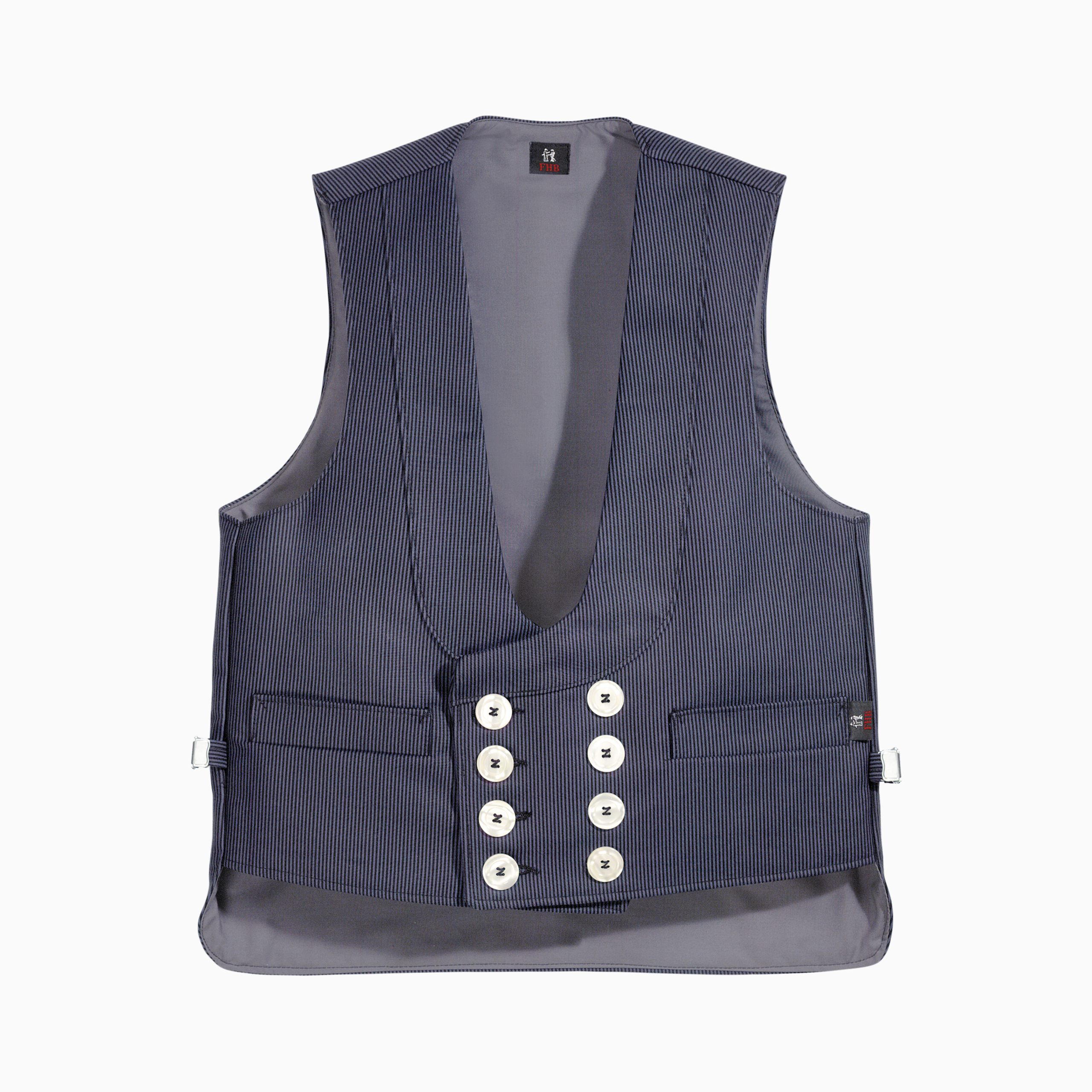 Traditionell zweireihig, achtknöpfig.Perlmuttimitatknöpfe.