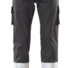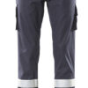 Dreifache Kappnähte an den Beinen und im Schritt. Gürtelschlaufen. Hosenschlitz mit Reißverschluss. Vordertaschen. Zwei Gesässtaschen, eine davon mit Patte. Schenkeltaschen mit Patte und Klettverschluss.