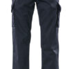 Dreifache Kappnähte an den Beinen und im Schritt. Gürtelschlaufen. Hosenschlitz mit Reißverschluss. Vordertaschen. Münztasche. Gesäßtaschen mit Verstärkungen und Patte mit Klettverschluss. Schenkeltaschen, die eine mit Patte und Klettverschluss. Handy-Schenkeltasche mit Patte und verstellbarem Klettverschluss. Stifttaschen.